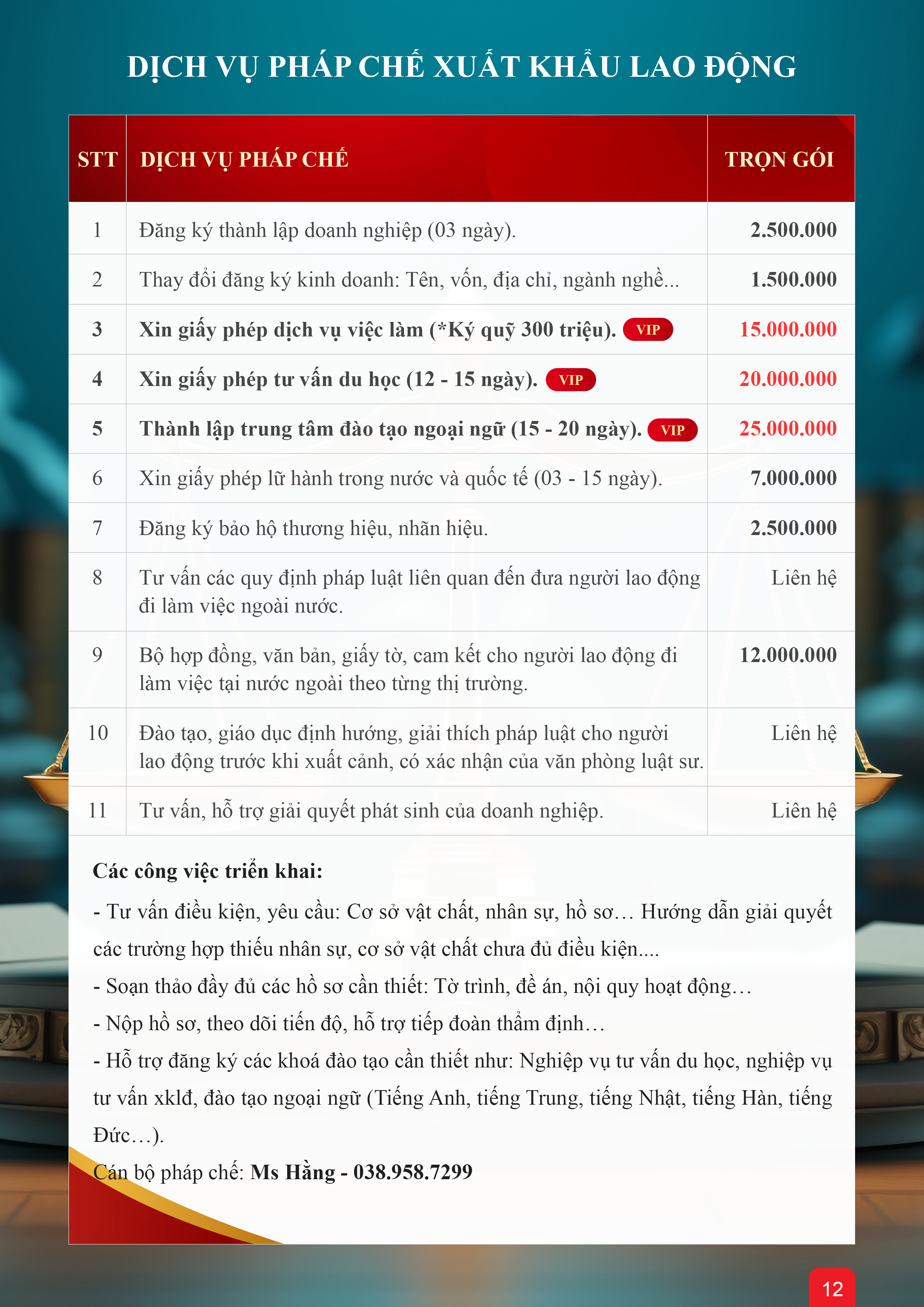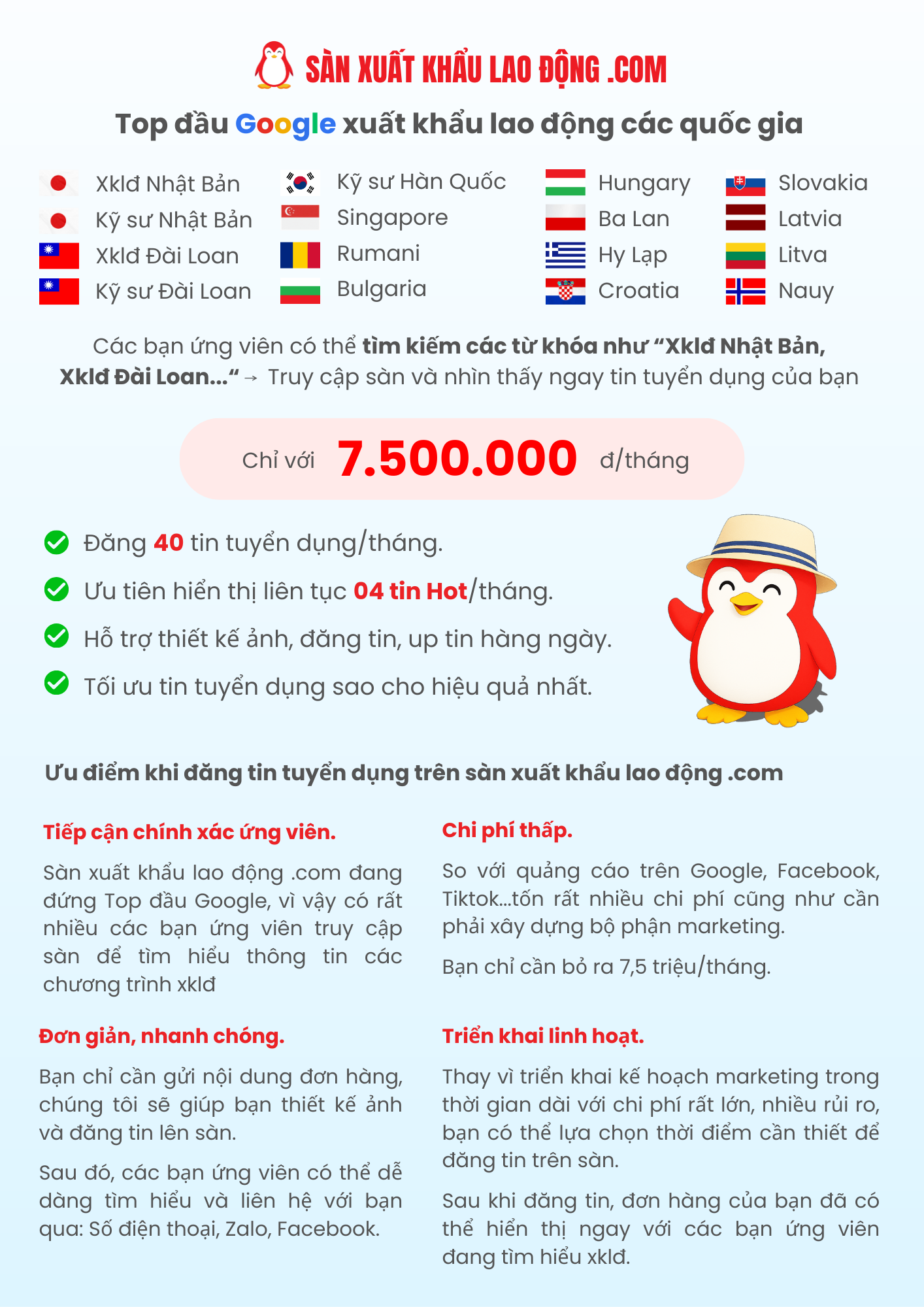Ứng viên lưu ý: Sàn xuất khẩu lao động .com là nền tảng kết nối thông tin, sàn không có chức năng đưa người lao động đi làm việc tại nước ngoài. Các tin tuyển dụng do nhà tuyển dụng trực tiếp đăng tải và chỉ có giá trị tham khảo, ứng viên cần tìm hiểu kỹ thông tin trước khi đăng ký. Để được tư vấn, ứng viên có thể bấm nút "Tư vấn giúp tôi" hoặc liên hệ trực tiếp với nhà tuyển dụng.