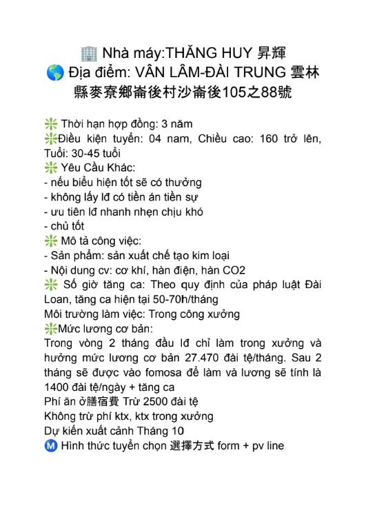 Đài Loan: cơ khí, hàn điện. Nam 30-45 tuổi