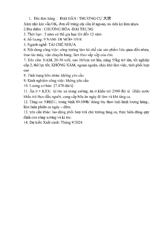 - Công xưởng làm tái chế các sản phẩm liên quan đến nhựa, thao tác máy, vận chuyển hàng, làm theo sắp xếp của chủ.