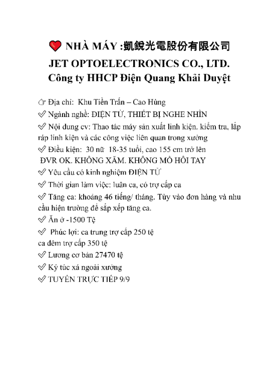 Đài Loan: điện tử Cao Hùng, tuyển nữ 18-35t