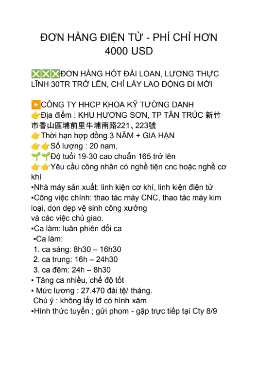 Đài Loan: đơn hàng cơ khí, CNC cho nam 19-30, phí 4x00 usd