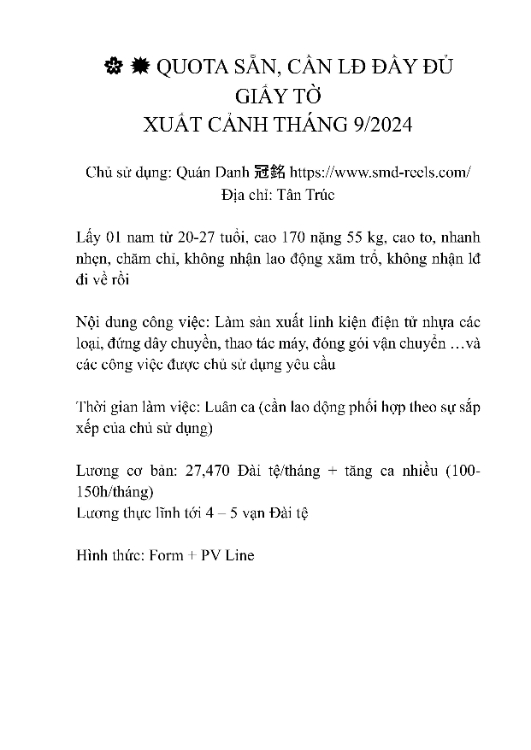 Ứng viên lưu ý: Sàn xuất khẩu lao động .com là nền tảng kết nối thông tin, sàn không có chức năng đưa người lao động đi làm việc tại nước ngoài. Các tin tuyển dụng do nhà tuyển dụng trực tiếp đăng tải và chỉ có giá trị tham khảo, ứng viên cần tìm hiểu kỹ thông tin trước khi đăng ký.