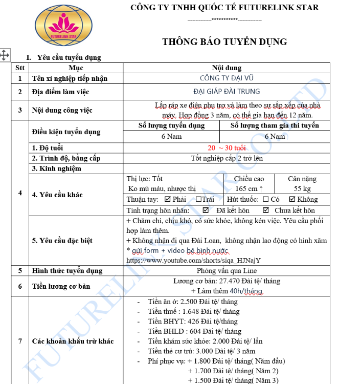 Hợp đồng kéo dài 3 năm, có thể gia hạn lên đến 12 năm. Yêu cầu tuyển dụng bao gồm: 6 lao động nam trong độ tuổi từ 20 - 30, tốt nghiệp cấp 2 trở lên, thị lực tốt, chiều cao từ 165 cm và cân nặng tối thiểu 55 kg. Ưu tiên ứng viên chăm chỉ, chịu khó, không kén việc và sẵn sàng làm thêm giờ. Các yêu cầu khác gồm không có hình xăm, không hút thuốc và không có tiền sử lao động tại Đài Loan.