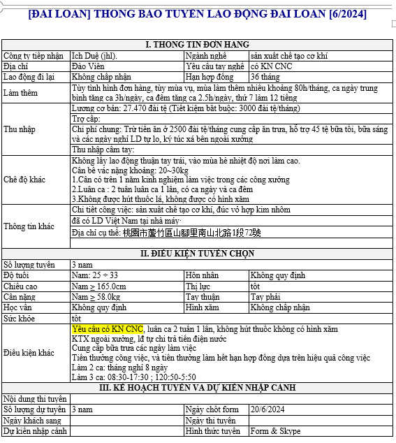Tuyển 08 Nam sản xuất thiết bị cơ khí tại Đài Loan làm thêm nhiều.