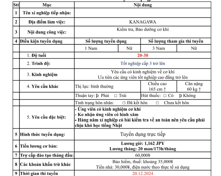 Ứng viên lưu ý: Sàn xuất khẩu lao động .com là nền tảng kết nối thông tin, sàn không có chức năng đưa người lao động đi làm việc tại nước ngoài. Các tin tuyển dụng do nhà tuyển dụng trực tiếp đăng tải và chỉ có giá trị tham khảo, ứng viên cần tìm hiểu kỹ thông tin trước khi đăng ký.