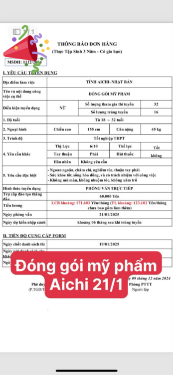 Nhật Bản: nam nữ kỹ sư vận hành máy sản xuất mỹ phẩm. Tiếng N4. Về tay 34 man