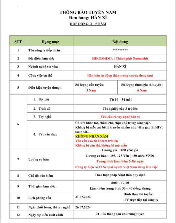 Ứng viên lưu ý: Sàn xuất khẩu lao động .com là nền tảng kết nối thông tin, sàn không có chức năng đưa người lao động đi làm việc tại nước ngoài. Các tin tuyển dụng do nhà tuyển dụng trực tiếp đăng tải và chỉ có giá trị tham khảo, ứng viên cần tìm hiểu kỹ thông tin trước khi đăng ký. Để được tư vấn, ứng viên có thể bấm nút "Tư vấn giúp tôi" hoặc liên hệ trực tiếp với nhà tuyển dụng.
