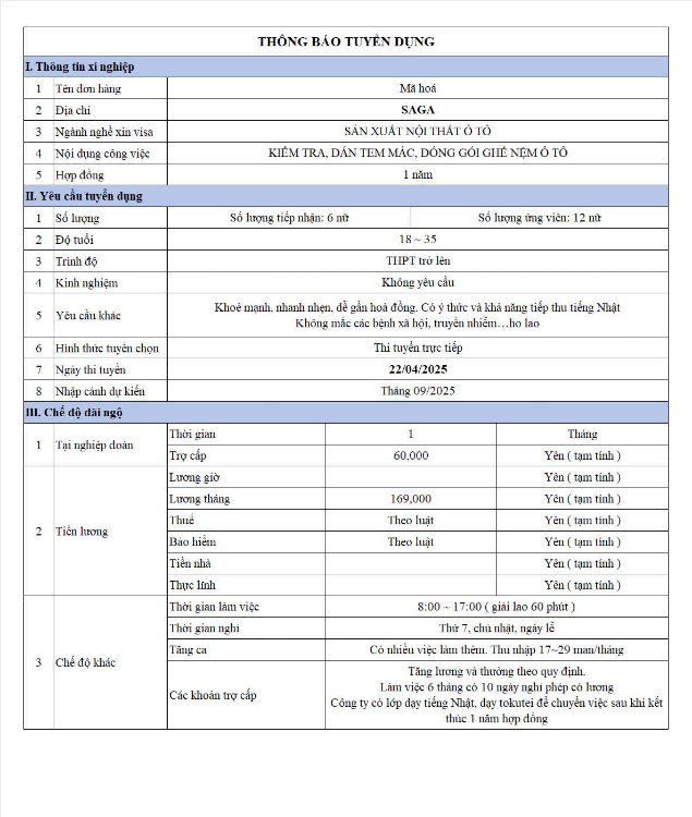 Ứng viên lưu ý: Sàn xuất khẩu lao động .com là nền tảng kết nối thông tin, sàn không có chức năng đưa người lao động đi làm việc tại nước ngoài. Các tin tuyển dụng do nhà tuyển dụng trực tiếp đăng tải và chỉ có giá trị tham khảo, ứng viên cần tìm hiểu kỹ thông tin trước khi đăng ký.