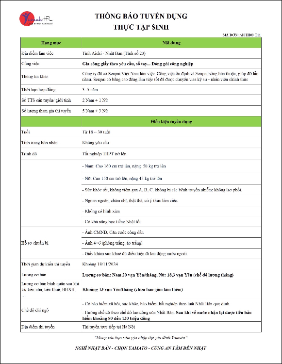 Tuyển TTS Đóng gói công nghiệp - Aichi