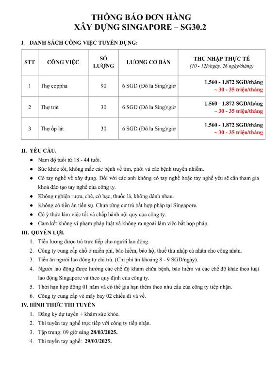 Singapore tuyển 20 nam thợ cơ khí, hàn xì, lương cơ bản 6 đô sing/giờ.